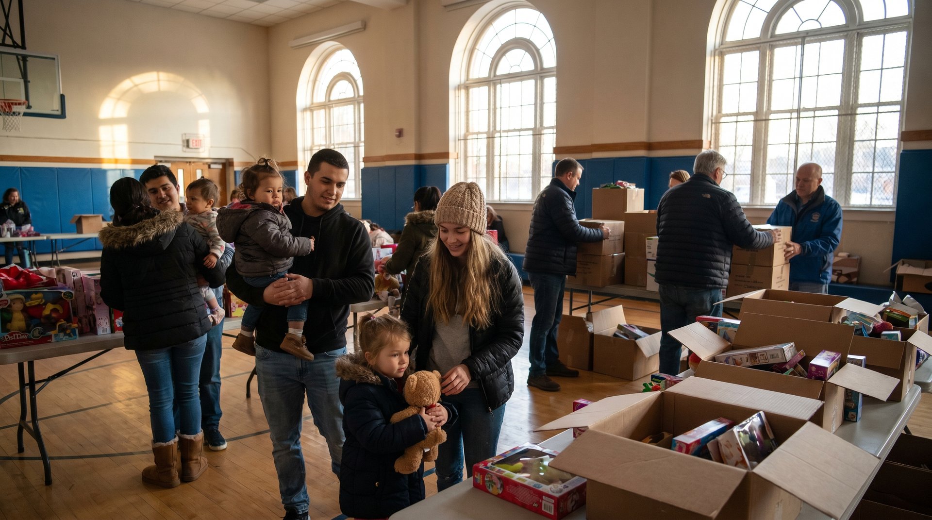 A community holiday distribution event with families receiving gifts